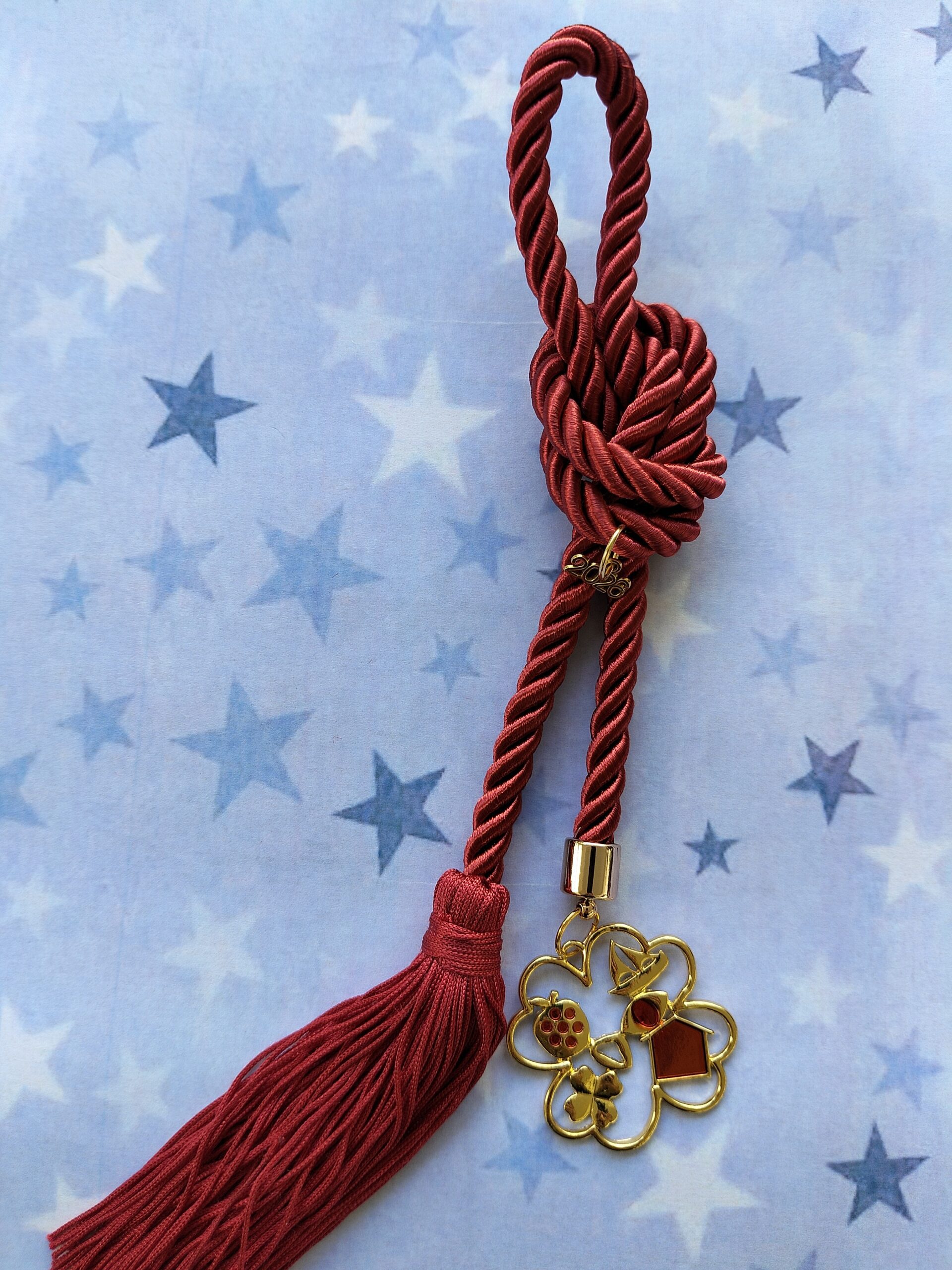 / Γούρι μεταλλικό με τετράφυλλο τριφύλλι και μπορντό κορδόνι