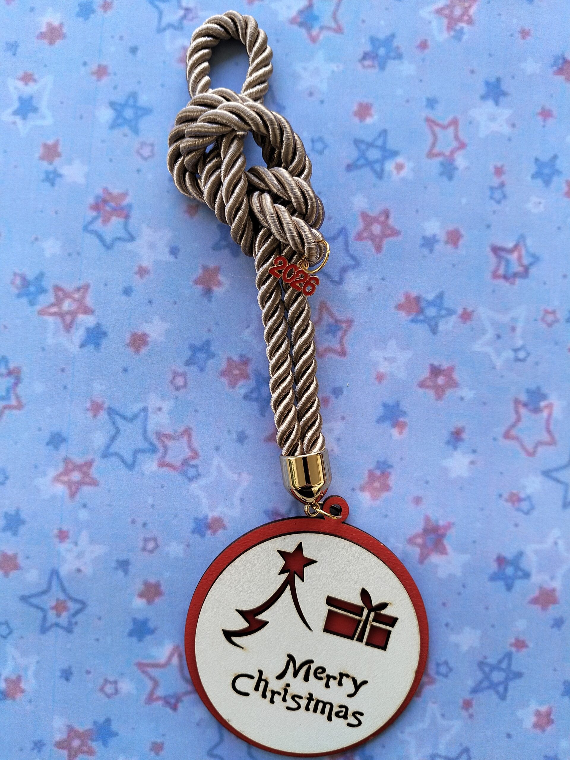 Ξύλινο γούρι Merry Christmas με χρυσό κορδόνι