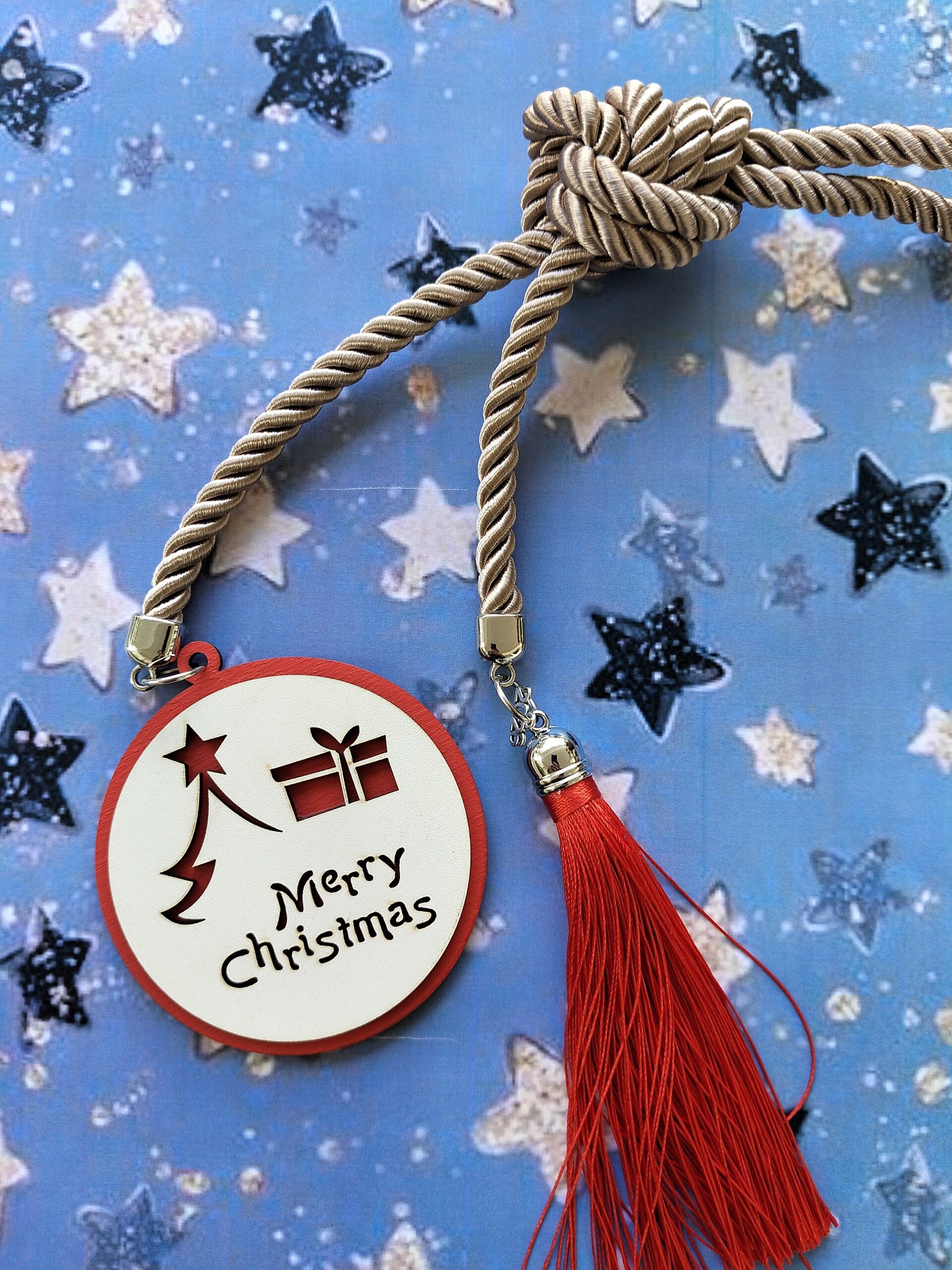 Ξύλινο γούρι Merry Christmas με χρυσό κορδόνι